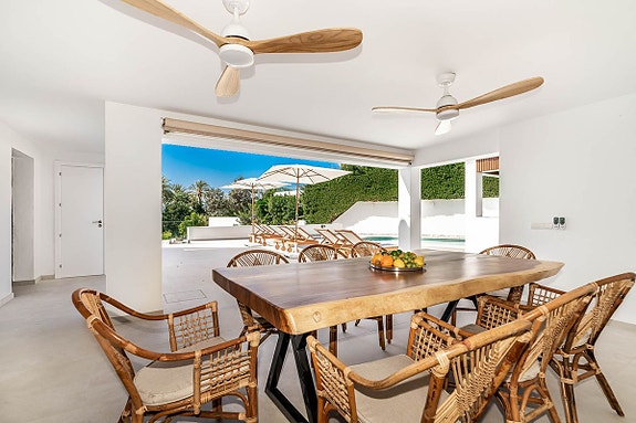 Til salgs: Luksuriøs villa i El Rosario, Marbella, med panoramautsikt over Middelhavet. Villaen er nylig ombygget for å tilby en åpen livsstil, har svømmebasseng, BBQ-område og hage. Interiøret er lyst med et moderne preg, to nivåer med totalt fem soverom, fire bad, SPA med sauna, vinrom og flere terrasser. Inkluderer også et bungalowkontor, komplett med møbler og utstyr. Villaen ligger nær Marbellas vakreste strender.