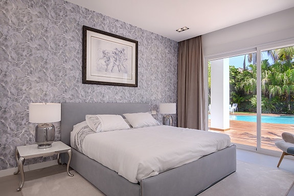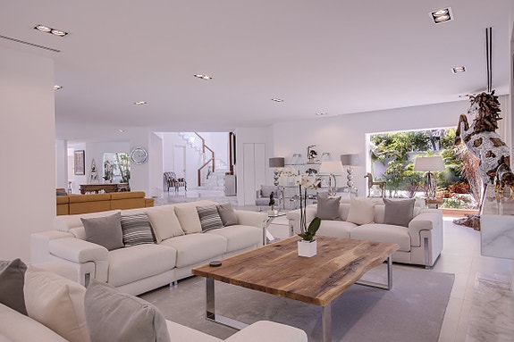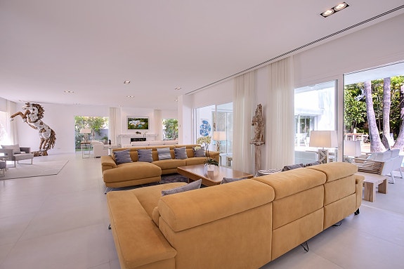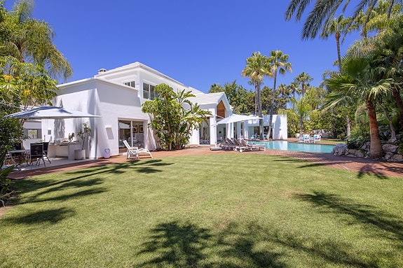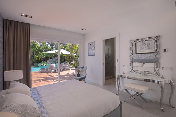 Denne eksklusive villaen, kjent som Casa Miami, tilbyr en privat oase i Guadalmina Baja, nær stranden. Den har en unik portugisisk steininngang, et moderne interiør med tre soverom, alle med egne bad og tilgang til en tropisk hage med to svømmebassenger, hvorav det ene er oppvarmet med jacuzzi. Hovedsoverommet byr på luksuriøst bad og terrasser, og huset har flere stuer og en spisestue, samt et kjøkken med toppmoderne utstyr. Villaen har også en imponerende terrasse og tilleggsfasiliteter som privat kontor og garasje.