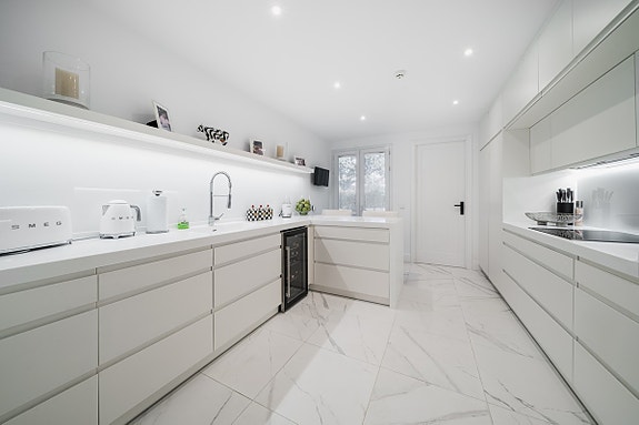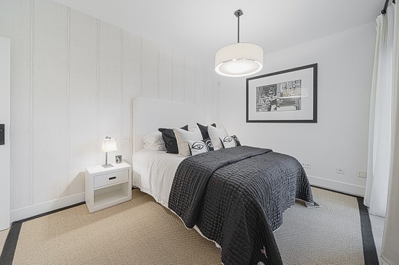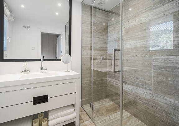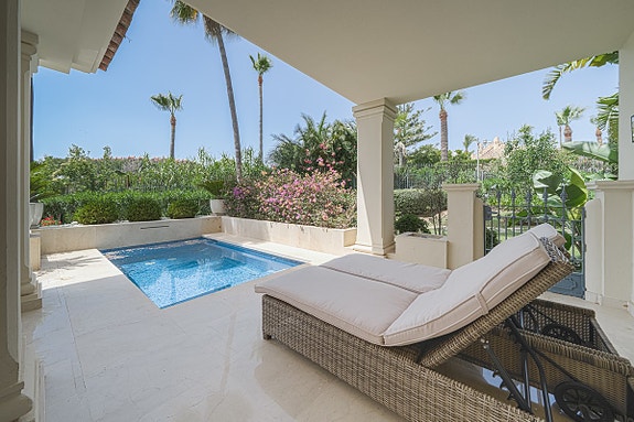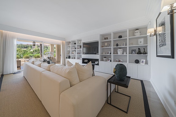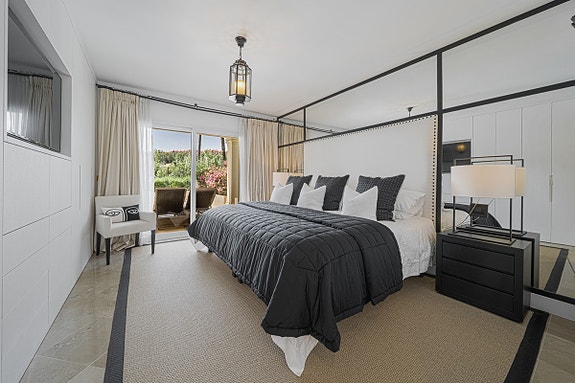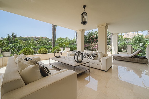 Lys leilighet på bakkeplan med 3 soverom og bad, stor stue og spisestue med peis. Den har også en overbygd terrasse med privat basseng og flott utsikt over hagene. Leiligheten, som er nyoppusset med marmorgulv og avansert klimaanlegg, ligger i et luksuriøst boligkompleks i Las Alamandas, Nueva Andalucía. Komplekset tilbyr 24-timers vakthold, videoovervåkning, tre svømmebassenger, hvorav ett er oppvarmet, og et treningsstudio. Det inkluderer også parkering i underjordisk garasje og bod.