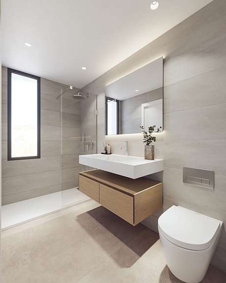 Villaene er romslige med 4 soverom og 4 bad med gulvvarme, og har sin egen private hage og svømmebasseng. Terrassene ved bassenget er et flott sted å slappe av og nyte solen. Kjøkkenet er moderne og utstyrt med alt du trenger.