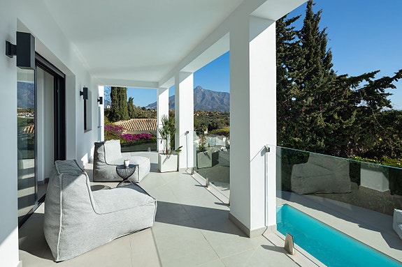 Villa med moderne design i hjertet av Nueva Andalucía, nær Puerto Banus og stranden. Den har 6 soverom med bad, to gjestetoaletter og to stuer, fordelt på to etasjer. Villaen tilbyr et kjøkken i åpen løsning, svømmebasseng, jacuzzi, lysthus, og uteområde for spising. Med utsikt til La Concha og privat hage er dette et perfekt underholdningssted og et godt ferieutleieobjekt. Carport har plass til 1-2 biler.