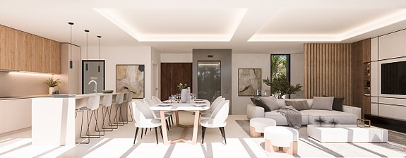 Rekkehusene har moderne og elegant design med fokus på lys og rom. Den åpne planløsningen integrerer sømløst med gulv-til-tak-vinduer som fører ut til store private terrasser. To- og treetasjers enheter gir variasjon, med mange som har private svømmebasseng som standard og store hager.Om boligen
