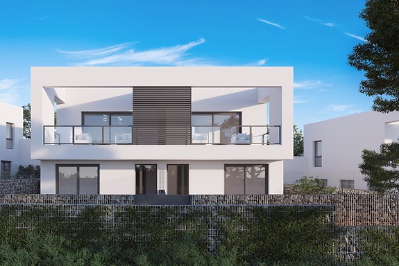 Disse nye rekkehusene har 3 soverom og et areal på opptil 145m². De er fordelt over to plan, inkludert en privat hage og muligheten for eget basseng!