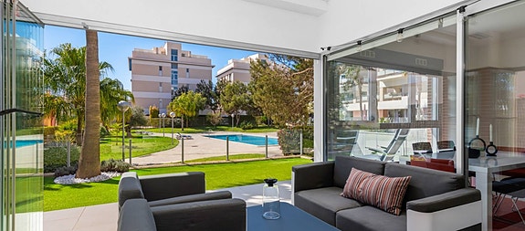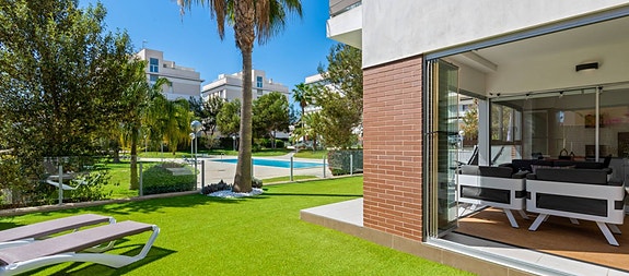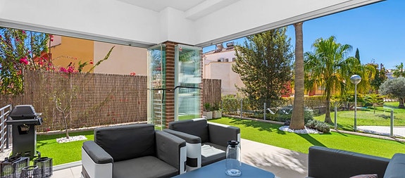 Vi i Spania1 gleder oss til å hjelpe dere videre i prosessen!La Zenia/ VillamartìnDenne moderne bakkeplanleiligheten i Los Dolses, Orihuela Costa, har 3 soverom og et elegant design. Med en romslig stue og spisestue med åpen kjøkkenløsning, to bad og et vaskerom, tilbyr den stil og komfort. Terrassen er delvis overbygd med glassgardiner og en sørvendt terrasse som vender ut mot en stor privat hage. Direkte tilgang til bassengområdet fra hagen, sammen med privat parkering og en bod, gir både luksus og praktisk bruk.