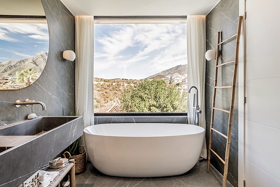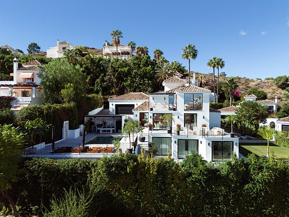 Moderne 5-soveroms hjem i Marbellas Golf Valley. Perfekt for en innendørs-utendørs livsstil og nær alle fasiliteter – et steinkast fra golf og Puerto Banús. Hovedsoverommet har bad, garderobe og balkong. Inkluderer kino og vinkjeller. Kontakt for visning.