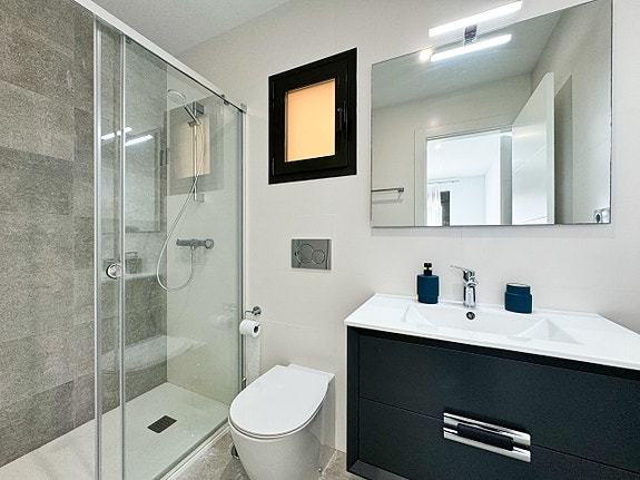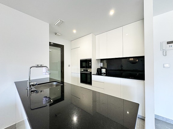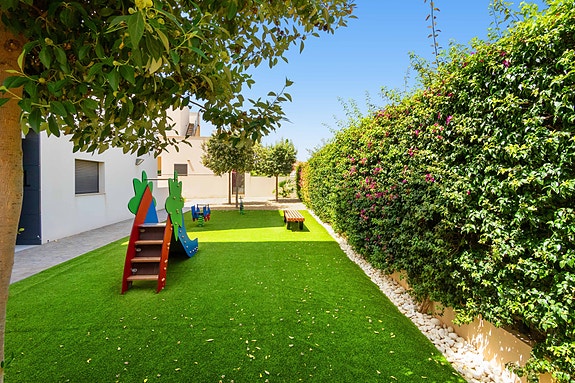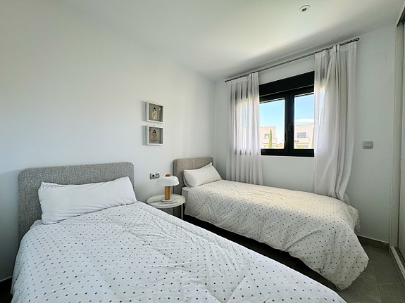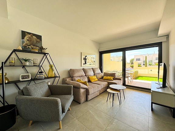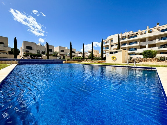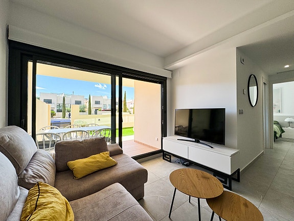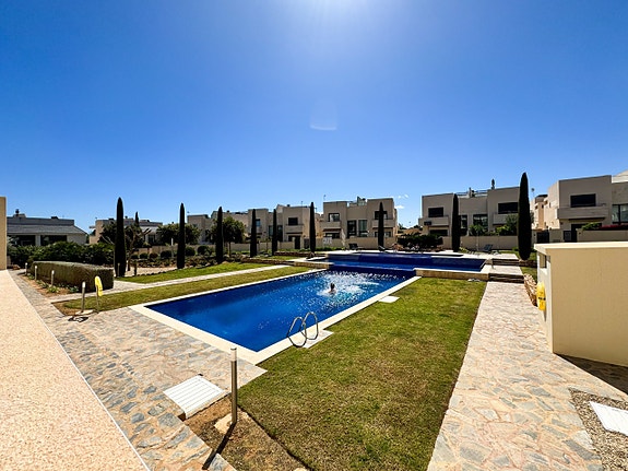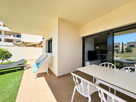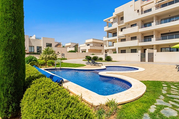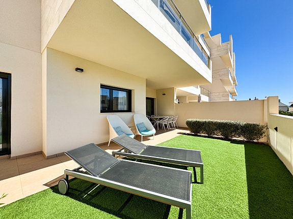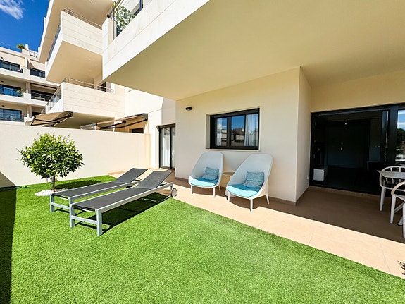 Spania1 har gleden av å presentere denne luksuriøse leiligheten i et elegant og fredelig boligkompleks, med en av de beste beliggenhetene i Los Dolses like ved La Zenia.Leiligheten har to romslige soverom og to bad. Leiligheten har utsikt over det nydelige fellesområdet med japansk hage og to svømmebasseng (hvorav 1 er oppvarmet) og solsenger. Den moderne stuedelen har et stilig åpent kjøkken med innebygde hvitevarer, god skapplass og en spiseplass. Leiligheten har en sørvendt orientering og har en hage på 44 m2. Det følger også med parkeringsplass og bod.