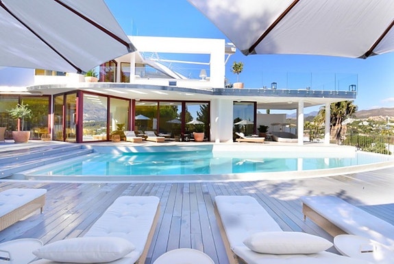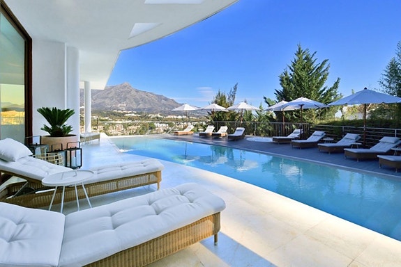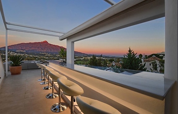 Moderne villa i hjertet av Nueva Andalucía, kort vei fra Puerto Banus og Marbella. Eiendommen har bredt utsyn mot Middelhavet, La Concha-fjellet og Golf Valley. Huset inneholder 7 soverom og bad, stor stue og 2 kjøkken. På takterrassen finnes et stort boblebad med utsikt. Det er også treningsrom, kinorom og spillrom med biljardbord. Ute er det et fullt utstyrt barområde med vinkjøler og grill, og et oppvarmet evighetsbasseng som gir fullstendig privatliv.