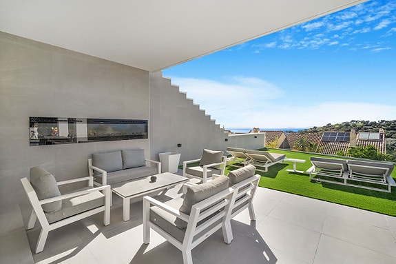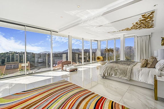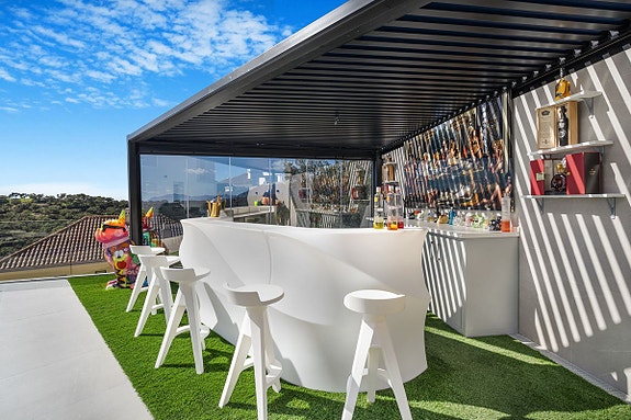 Villa i Elviria Alto/La Mairena med åpent planløsning og utsikt. Eiendommen tilbyr oppvarmet basseng og bar på terrassen, og sol hele dagen. Perfekt for sosialt liv og underholdning. Carport med to plasser og sikker port. Hovedsoverommet i øverste etasje har eget bad og garderobe, pluss to andre soverom og bad med gulvvarme. I kjelleren finner du det fjerde soverommet med bad, garderobe, treningsrom og lagringsplass. Drevet av solenergi. Ti minutter fra stranden og Elvirias butikker og spisesteder.