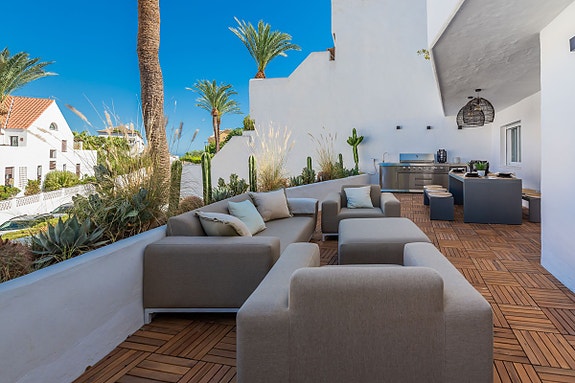 Nylig renovert leilighet i Marbella med skandinavisk design, 4 soverom, 2 bad, og en romslig terrasse med utendørskjøkken. Omringet av frodige planter og palmer, ligger denne boligen i gåavstand til alt man trenger for en perfekt ferie eller som en investering med høyt utleiepotensial. Tilbyr privat parkering.