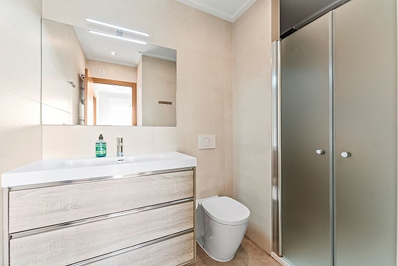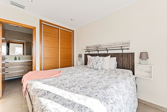Boligen har 2 soverom og 2 bad. Det første soverommet har innebygde garderobeskap og plass til dobbeltseng. Det er også et moderne bad med dusj tilknyttet soverommet.