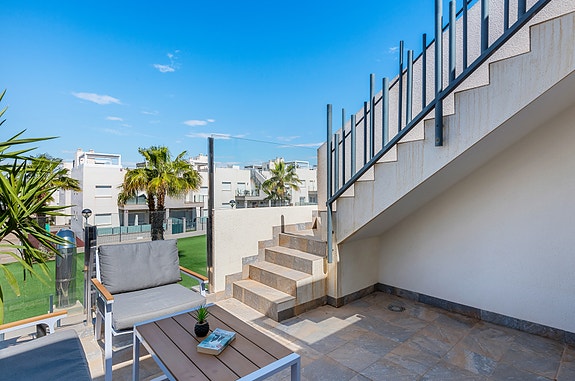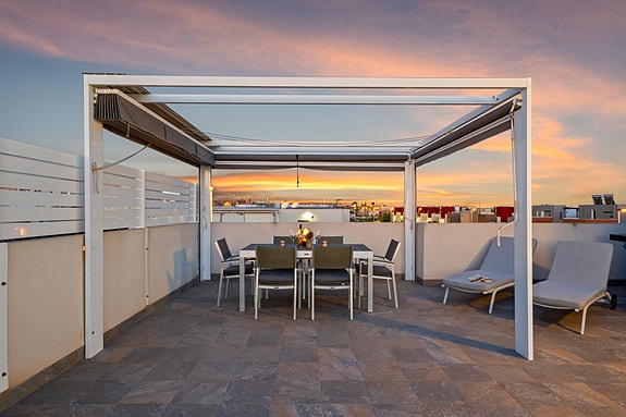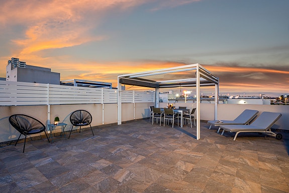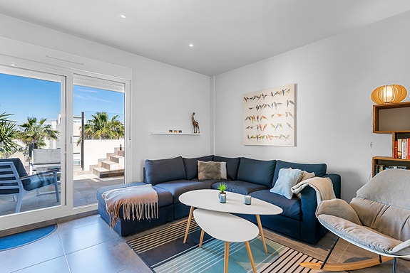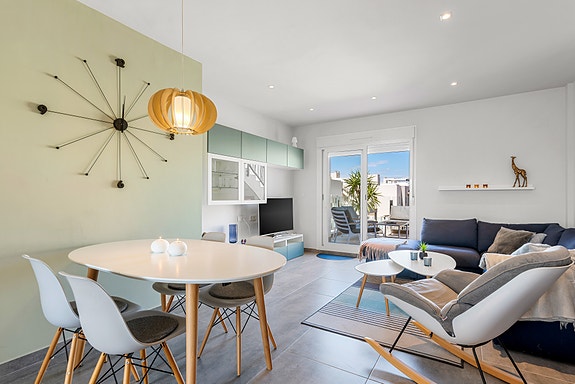 Spania1 har gleden av å presentere denne flotte penthouse-leiligheten i det populære komplekset Sol Park i Aguas Nuevas. Beliggende bare noen få minutter å til restauranter, kaféer og butikker gjør dette til et svært populært område hvor man ikke er avhengig av bilen. Ønsker man en tur på en av de flotte strendene er det en sykkeltur på 10 min fra leiligheten.Leiligheten inneholder 2 soverom med innebygde garderober, 2 delikate bad, lys og luftig stue med åpen kjøkkenløsning, vestvendt terrasse utenfor stuen, samt en enorm takterrasse som sikrer sol hele dagen. På takterrassen er har man en liten bod med varmtvannsbereder og vaskemaskin.