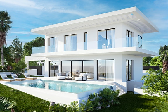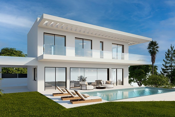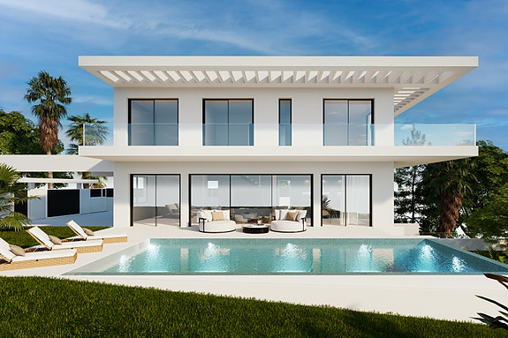 Denne moderne villaen er designet med tanke på optimal plassutnyttelse, naturlig lys og ventilasjon i alle rom. Den romslige stuen med åpen planløsning og integrert kjøkkenøy gir direkte tilgang til basseng og hage gjennom store vinduer. Ovenpå finner du to store soverom og et master soverom med eget bad og garderobe. Takterrassen har forhåndsinstallasjon for solcellepaneler. Valgfri full kjeller og mulighet for fjerde soverom på bakkenivå. Uteområdet har overbygde terrasser, privat basseng og parkering for to biler.Om boligen