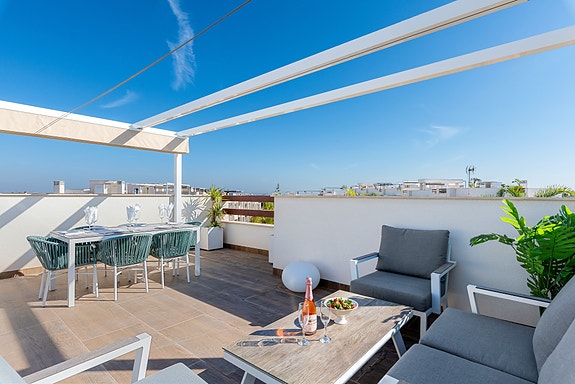 Dette eksklusive boligkomplekset heter Los Balcones de Amay, som ligger rett ved saltsjøen i Los Balcones, Torrevieja. Denne eiendommen består av 3 soverom med innebygde garderober, 2 bad (hvorav ett med eget bad), stue med åpen kjøkkenløsning, Denne leiligheten har en nydelig takterrasse på 57 m2 og en terrasse ut fra stuen som vender mot bassenget. I tillegg er det et stort felles svømmebasseng og grønne hager. Denne leiligheten selges fullt møblert, inkludert senger av meget høy kvalitet, samt en parkeringsplass og bod i den underjordiske parkeringen.