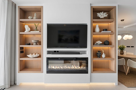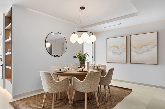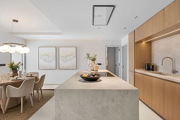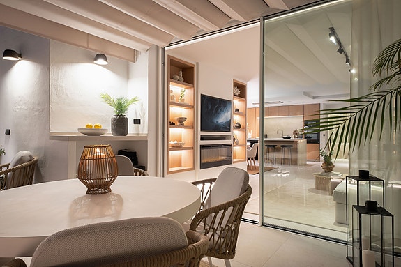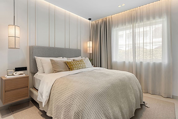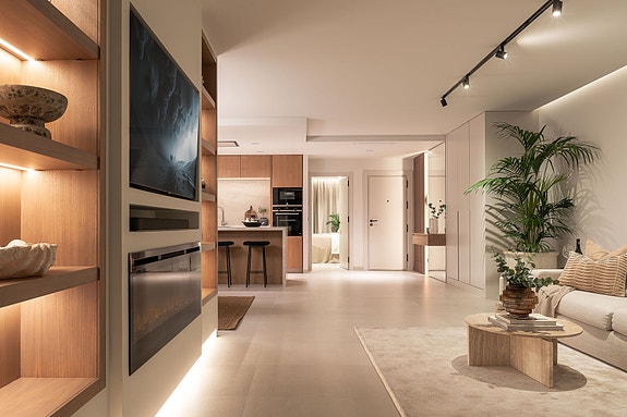 Stuen, utstyrt for både avslapning og underholdning, har gulv-til-tak-vinduer, en chaise longue-sofa, og skreddersydde bokhyller med LED-lys.Boligens tre soverom er luksuriøst innredet med dimbare spotlights, LED-stemningsbelysning, blendingsgardiner og skreddersydde møbler. Badene har Porcelanosa-armaturer, gulvvarme og skreddersydde møbler.