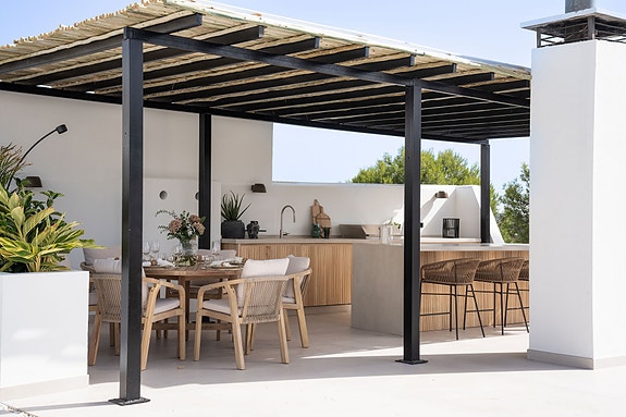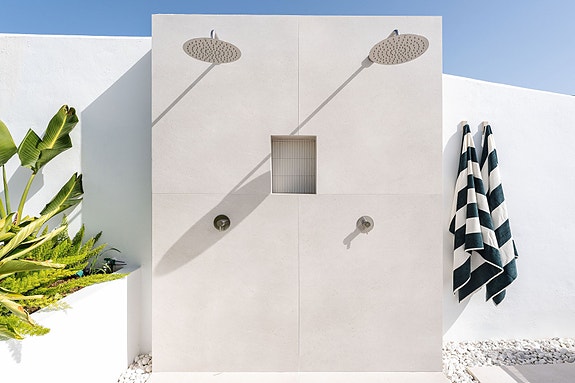Utendørsområdene inkluderer en nedre terrasse med LED-belysning og automatisk vanning, samt en stor øvre terrasse med sklisikre fliser, utekjøkken og grill. Fellesområdet tilbyr to svømmebassenger.