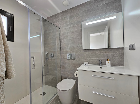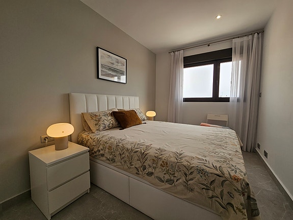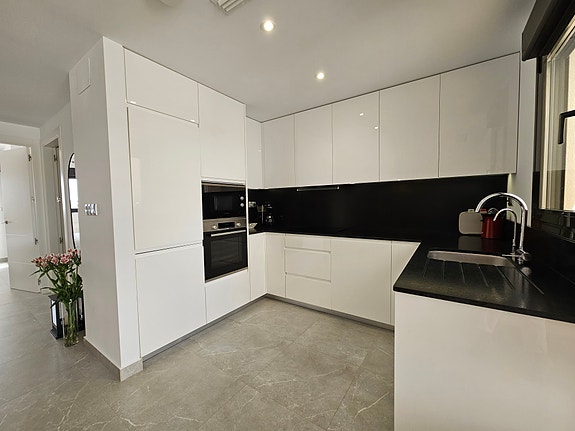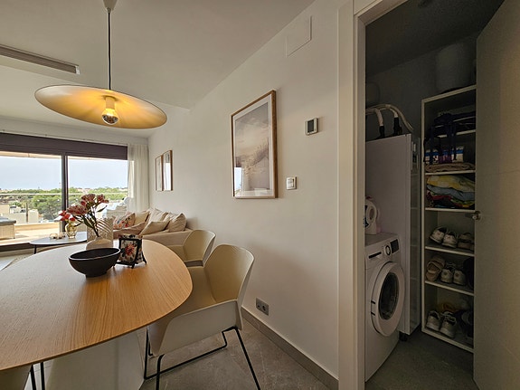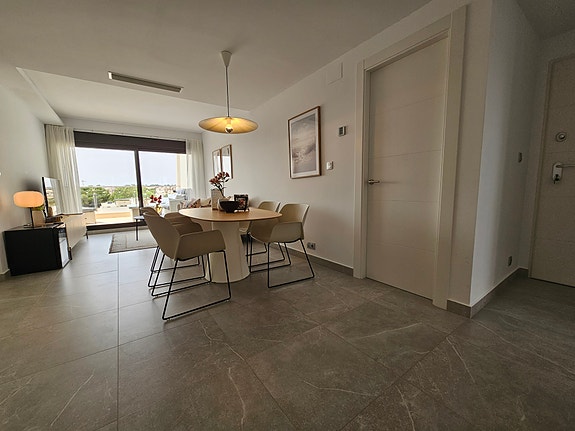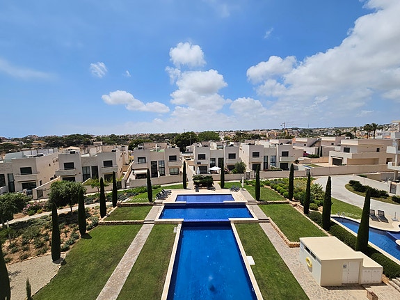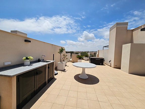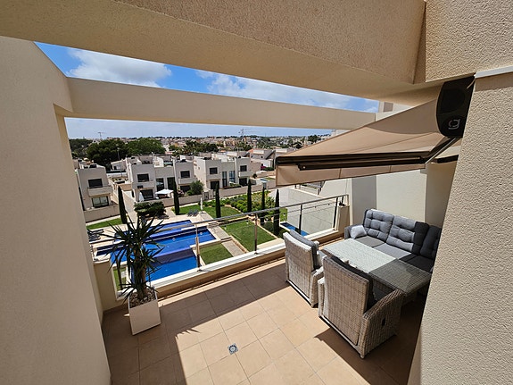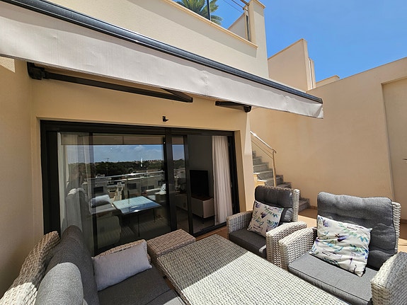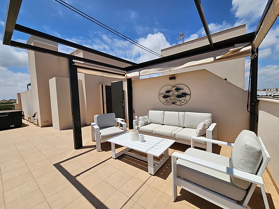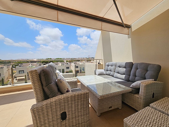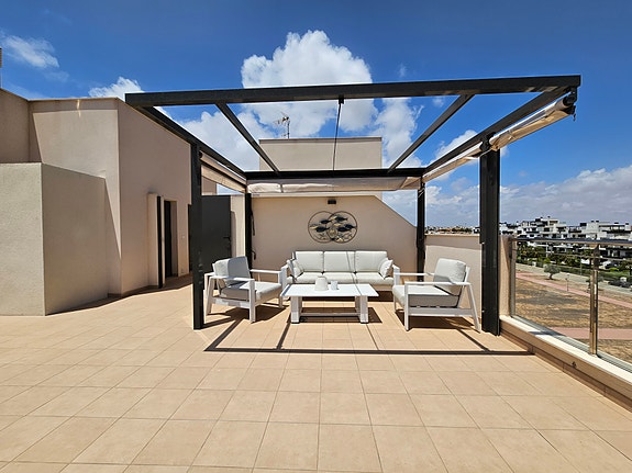 Spania1 har gleden av å presentere en fantastisk sørvendt penthouseleilighet med havutsikt, beliggende i et eksklusivt og rolig privat boligkompleks i Los Dolses, midt mellom Villamartin og La Zenia. Leiligheten inneholder 2 soverom med innebygde garderober, 2 delikate bad med gulvvarme, lys og luftig stue med åpen kjøkkenløsning, vaskerom, sørvendt terrasse utenfor stuen, samt en enorm takterrasse med panoramautsikt over landskap og Middelhavet. Dette er en leilighet med særdeles høy standard, blant annet kommer det med integrert air condition system, hvitevarer, gulvvarme på bad og elektriske persienner. Det er privat parkeringsplass i det underjordiske garasjeanlegget, og på takterrassen har du enkel tilgang via en dør til en stor bod til tilhører kun denne leiligheten. Du har full oversikt over det flotte fellesområdet hvor det er en japansk hage og to svømmebasseng (hvorav barnebassenget er oppvarmet på vintertid).