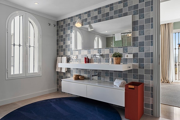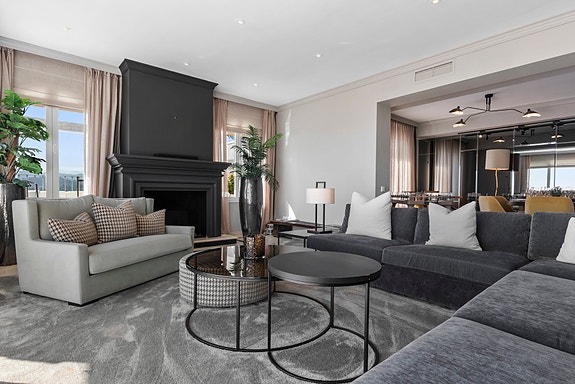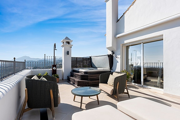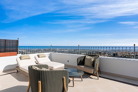 Spania1 har gleden av å presentere denne duplex-penthousen, som ligger i det eksklusive samfunnet Las Colinas. Boligen tilbyr spektakulær panoramautsikt og førsteklasses sikkerhet med døgnkontinuerlig overvåking. Interiøret oser av luksus, med høykvalitets finish og designer-møbler i alle rom. Alle tre terrassene har utsikt over Middelhavet, med den største utstyrt med grillområde. Den åpne stue- og kjøkkenløsningen er perfekt for sosialt samvær og nyter også den imponerende utsikten. Puerto Banús ligger bare 10 minutters kjøretur unna. Eiendommen har 4 soverom, 3 bad og et gjestetoalett, fordelt på 425 m² inkludert terrassene. Denne penthousen tilbyr enestående eleganse og komfort, med egen utendørs jacuzzi.