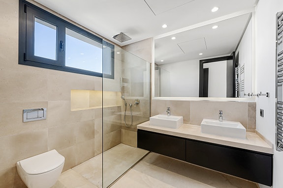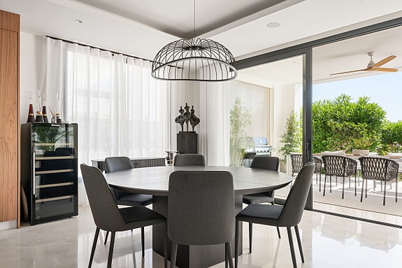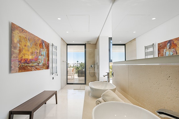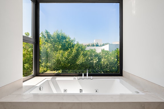 - Fasiliteter: Kremfargede marmorgulv, Villeroy & Boch armaturer, gulvvarme, Sonos lydsystem, oppvarmet basseng, automatisk deksel og solcellepaneler.