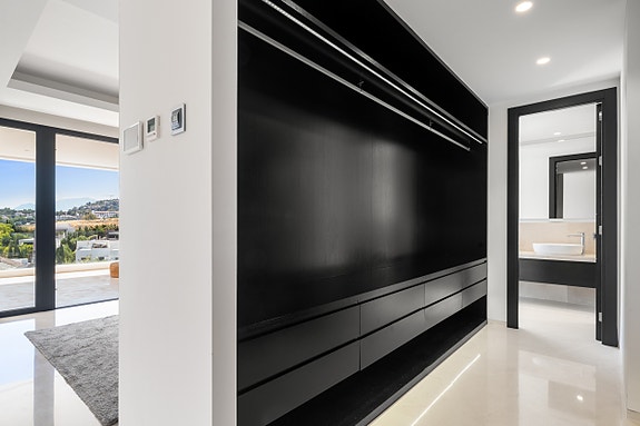 På dette nivået finnes også et stilfullt gjesterom med eget bad og tilgang til hagen, samt et ekstra gjestetoalett. Stuen åpner seg mot en panoramaterrasse med spiseplass, gassgrill og en avslappingssone med store sofaer og solsenger, hvor du kan nyte utsikten over den frodige hagen og fjellene.I andre etasje er hovedsoverommet et virkelig fristed med et hydromassasjebadekar som ser ut over hagen. Her er også to sjarmerende gjesterom, begge med egne bad. Hovedsoverommet og ett gjesterom har tilgang til en stor terrasse med fantastisk sjøutsikt.