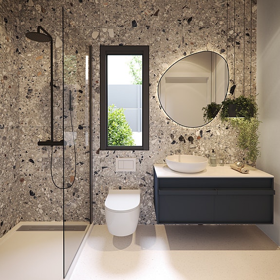 - Bad med vegghengt toalett og dusj