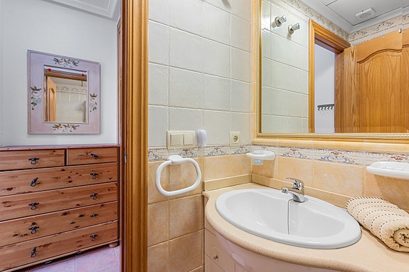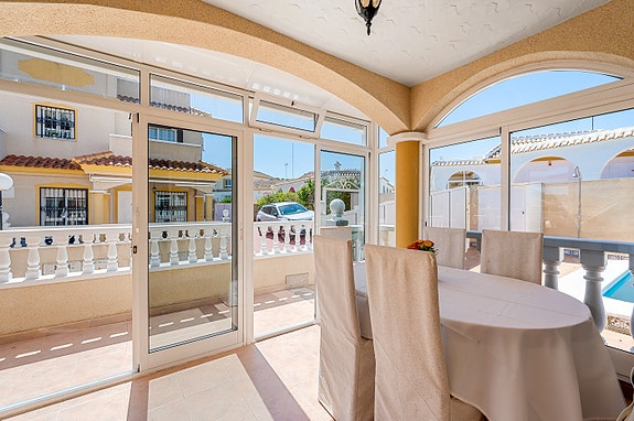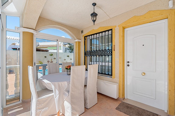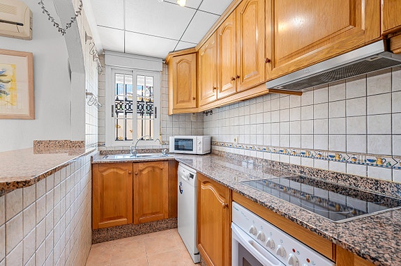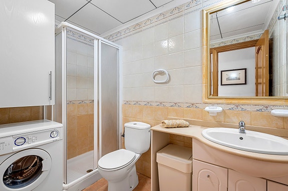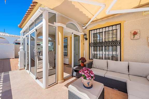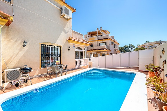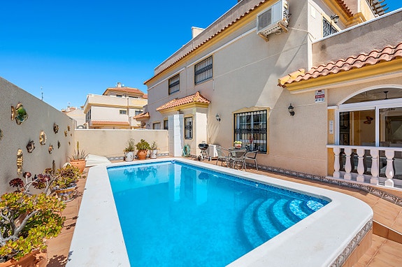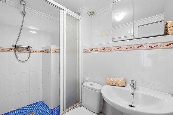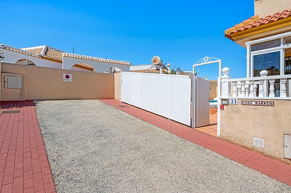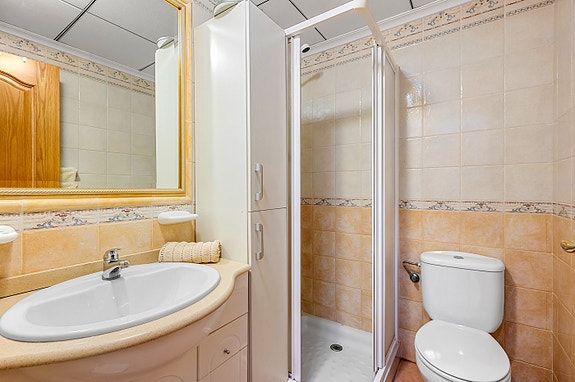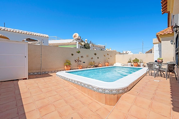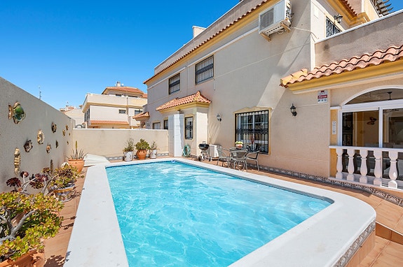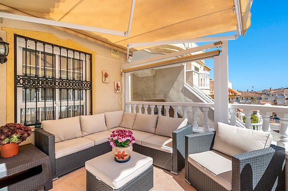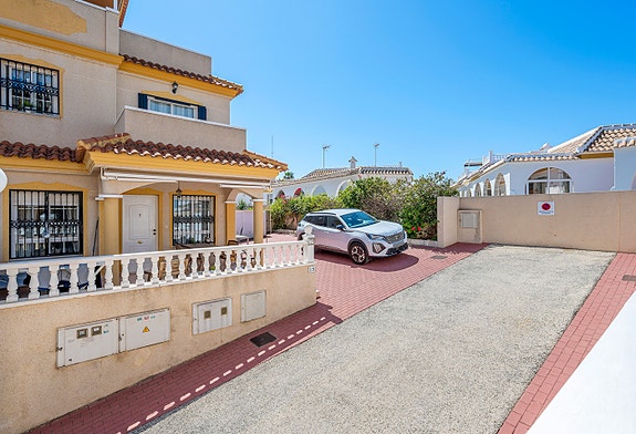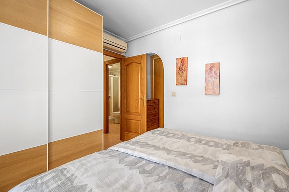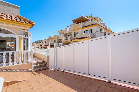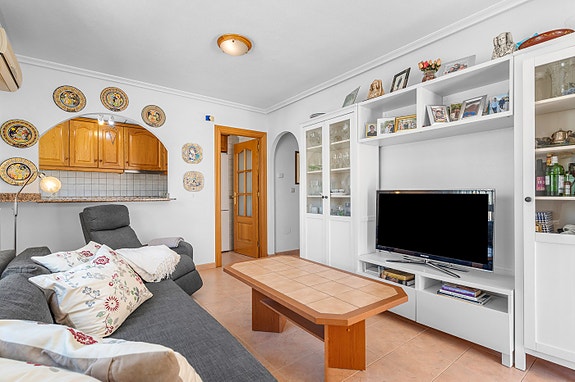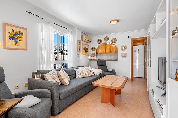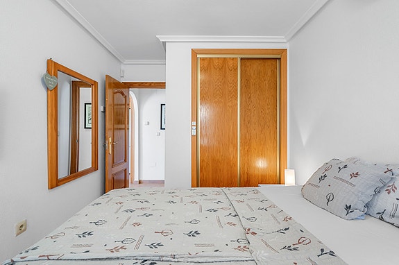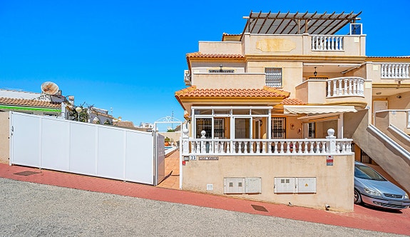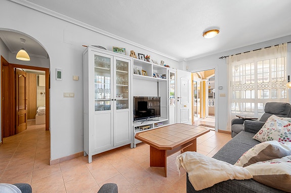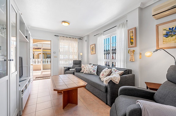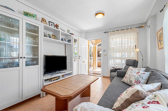 Vi har gleden av å presentere denne velholdte hjørneleiligheten i første etasje, beliggende i en forhøyet posisjon i det populære boligområdet Los Estaños i Guardamar. Eiendommen har en romslig og solrik terrasse med sol hele dagen, og skiller seg ut som den eneste enheten i komplekset med eget privat basseng.