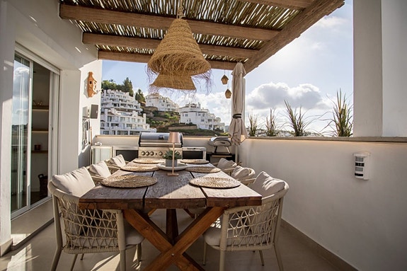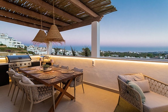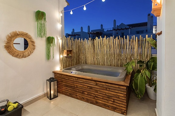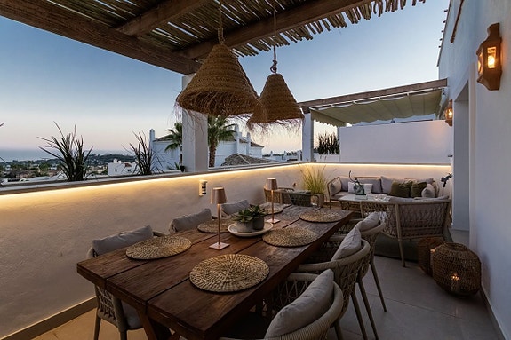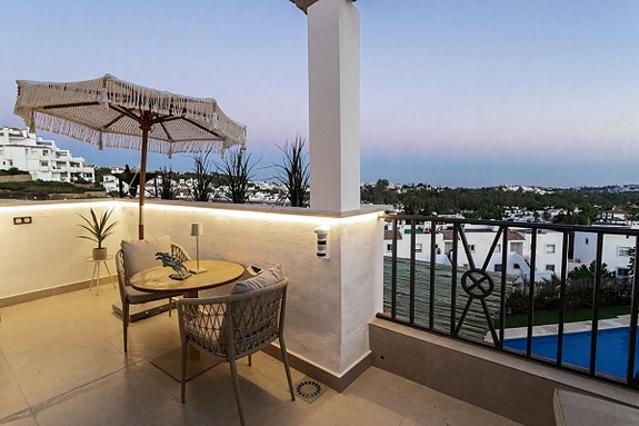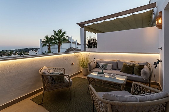 Denne fantastiske toppleiligheten med 3 soverom og 3 bad ligger i det ettertraktede området Golf Valley, Nueva Andalucia. Leiligheten på over 150 m² er sørvendt og fylt med naturlig lys. Den har en moderne åpen kjøkken- og stueløsning som åpner opp til en romslig terrasse. En privat terrasse med jacuzzi gir den perfekte muligheten for avslapning. Boligen er renovert til høy standard med klimaanlegg, sentralvarme og peis for helårskomfort. Eiendommen inkluderer også en privat garasje, bod og gir en attraktiv investeringsmulighet med høy leieinntekt.