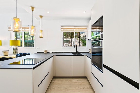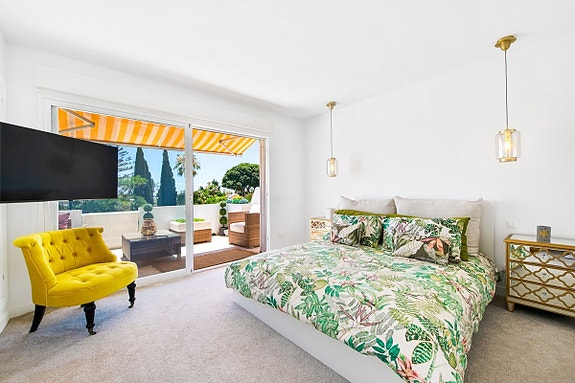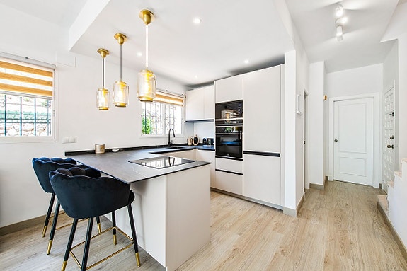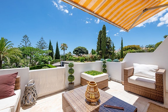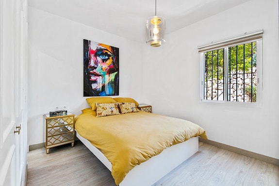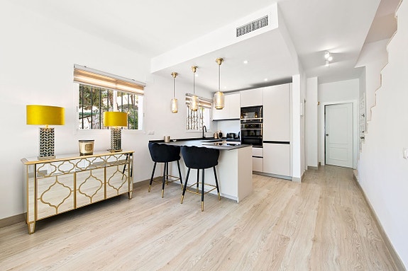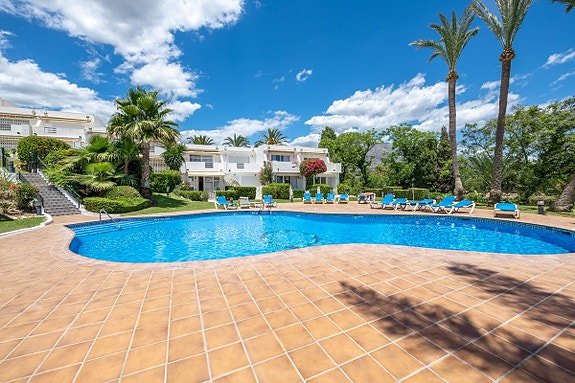 Dette moderne rekkehus med 2 soverom ligger nær Aloha Golf Club i Nueva Andalucía, nylig renovert for å tilby en stilfull og komfortabel bo-opplevelse. Boligen har en sørvendt terrasse og privat hage, perfekt for utendørs avslapning. Huset er en del av et inngjerdet kompleks som gir høy grad av privatliv og sikkerhet, samt enkel tilgang til fasiliteter som butikker, restauranter og Puerto Banús.