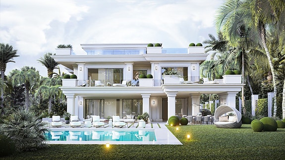Denne villaen ligger i det prestisjefylte området Lomas de Marbella Club på Golden Mile. Villaen er omgitt av hage med grønne områder og har en opphøyet plassering som gir en vakker utsikt over både havet og La Concha-fjellet. Eiendommen har 6 soverom fordelt på 3 nivåer, inkludert flere underholdningsområder, et oppvarmet saltvannsbasseng, og et solarium på taket med treningsområde. Boligen har en blanding av klassisk og moderne design med materialer av høyeste kvalitet og tilbyr eksklusivitet med fasiliteter som eget personaleleilighet, stor parkeringsplass, og luksuriøst interiør.