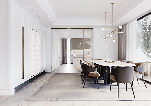 - Luksuriøse detaljer som høyt tak, peis, og store vinduer