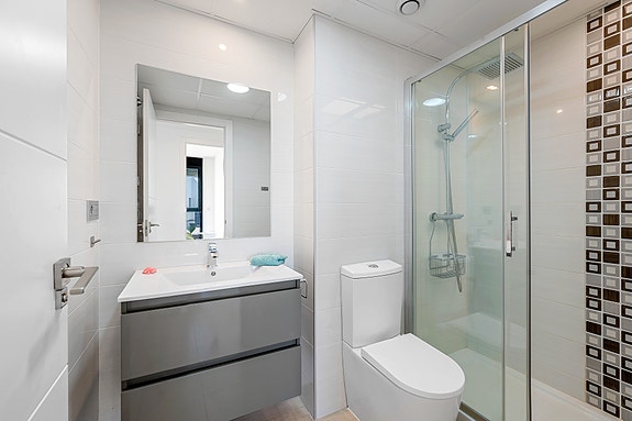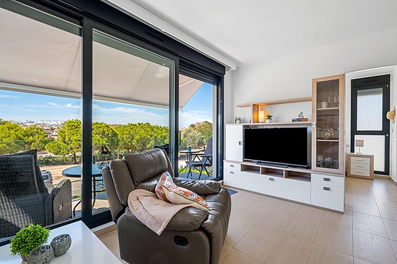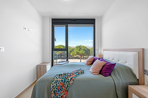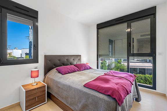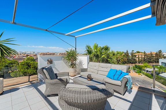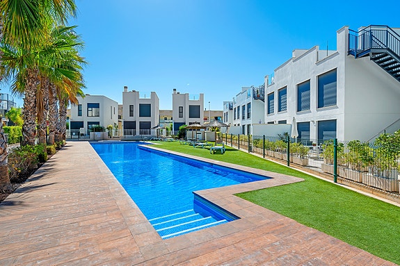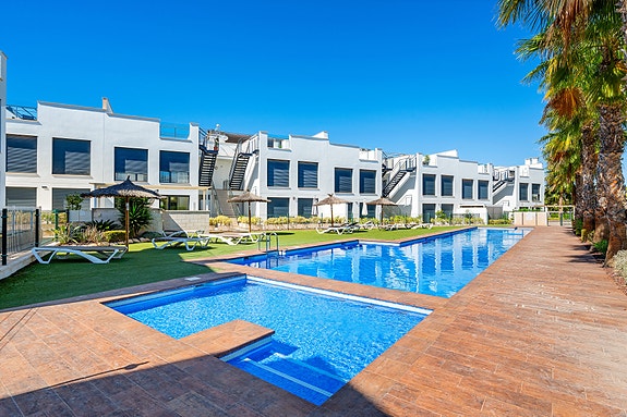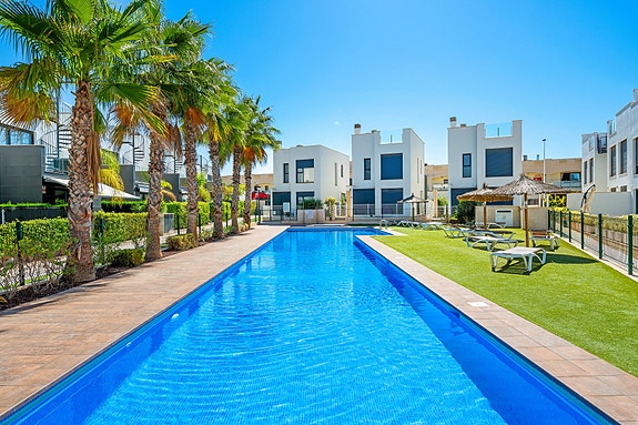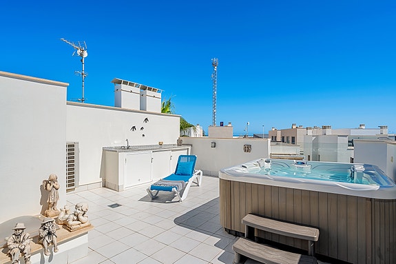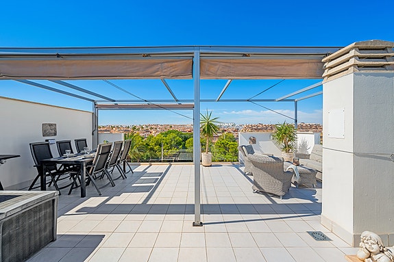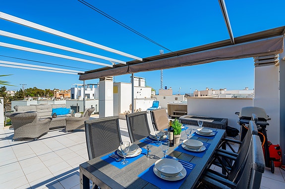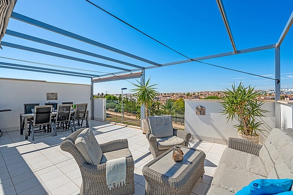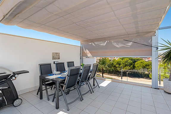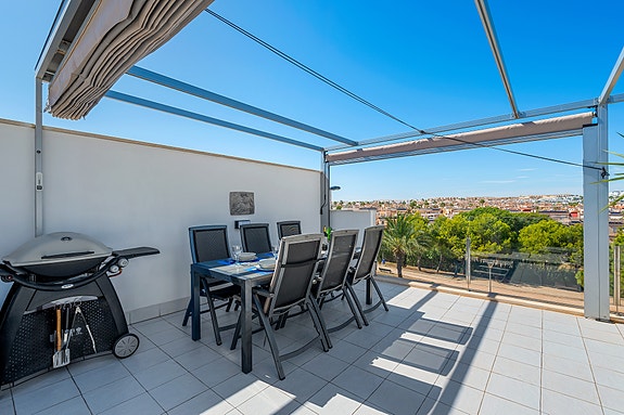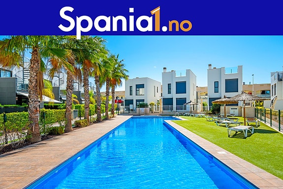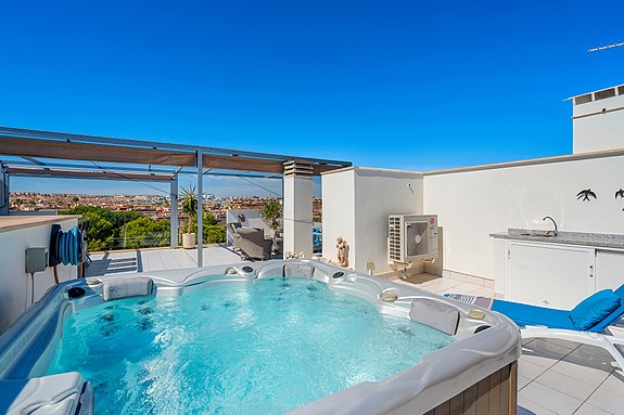 Spania1 har gleden av å presentere denne flotte toppleiligheten i hjertet av Punta Prima. Med kort gangavstand til alt du trenger – kun få minutter til matbutikker, kafeer, vinbarer og et bredt utvalg restauranter. Stranden er bare en 15-20 minutters spasertur unna.Leiligheten er toppmoderne og meget velholdt. Den inneholder tre soverom med innebygde garderober, to elegante bad, en åpen stue- og kjøkkenløsning, vestvendt terrasse med fri utsikt over en vakker park, og en stor privat takterrasse med jacuzzi. Hjørneplasseringen gir ekstra lys, luft og økt privatliv.