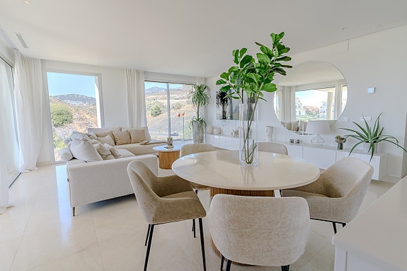 Denne luksuriøse leiligheten i Nueva Andalucía har 4 soverom og 4 bad, i tillegg til et gjestetoalett. Leiligheten har en sørvestlig orientering som gir maksimal naturlig belysning og en romslig, åpen løsning med kjøkken, spisestue og stue. Store glassdører skaper en sømløs overgang mellom innendørs- og utendørsarealene, med en terrasse som tilbyr vakker utsikt over fjell og hav. Hovedetasjen har også to gjesterom og et hovedsoverom, alle med egne bad. Eiendommen har i tillegg tilgang til en terrasse med basseng og privat hage. Leiligheten ligger nær flere kjente golfbaner og andre nødvendige fasiliteter.