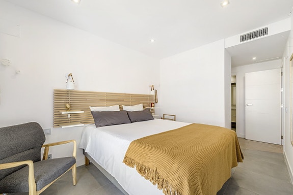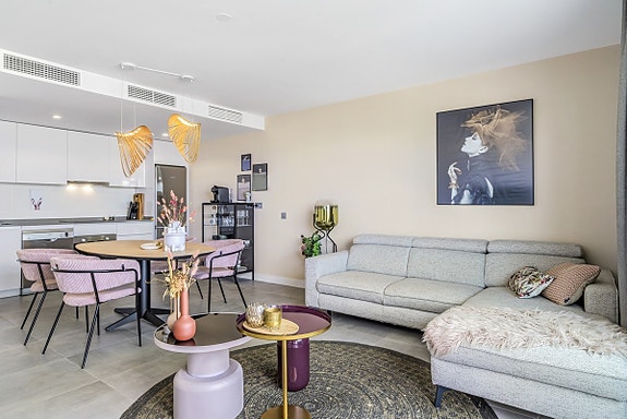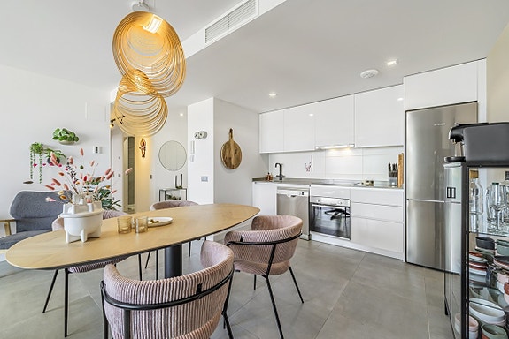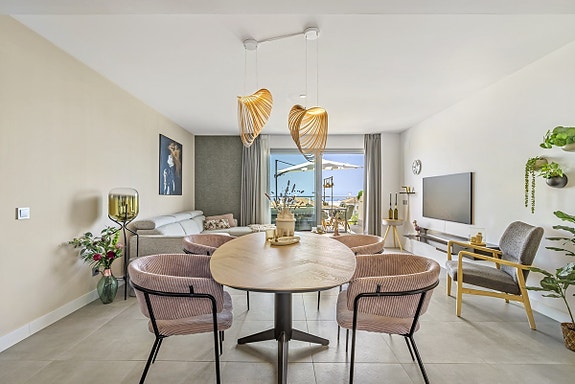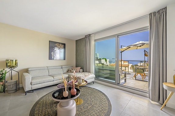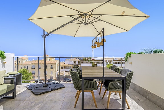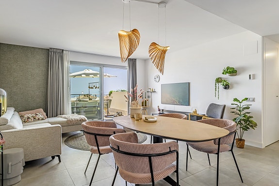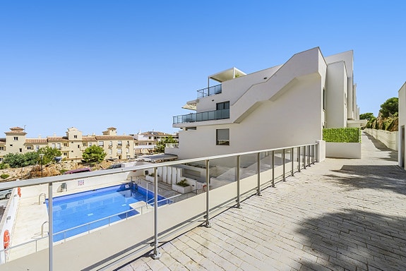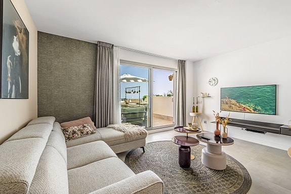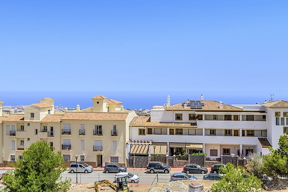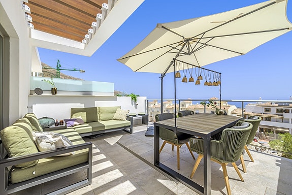 Spania1 har gleden av å presentere denne flotte leiligheten i et moderne, inngjerdet kompleks i Benalmádena Pueblo. Komplekset ligger på en åsside med panoramautsikt over Middelhavet og fjellene. Området er rolig og boligpreget, men landsbyen ligger under 10 minutters gange unna med tilgang til fasiliteter, transport og tjenester. Komplekset har underjordisk parkering, basseng, treningsstudio og en gourmetklubb for arrangementer. Leiligheten ligger i første etasje med heis direkte fra garasjen. Den har åpen kjøkken/stue-løsning, stor privat terrasse, to soverom, to bad med gulvvarme og sentralisert klimaanlegg. To parkeringsplasser og bod følger med. Møbler kan forhandles separat.