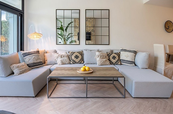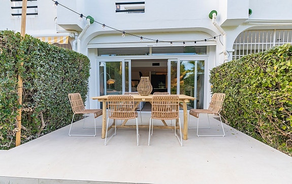 Denne nyrenoverte boligen i Los Algarrobos, Nueva Andalucía, tilbyr et luksuriøst townhouse med tre soverom og sørvendt beliggenhet med golfutsikt. Interiøret er totalrenovert av et av Marbellas ledende designstudioer, og boligen er nøye omfordelt for å maksimere plassen. Boligen har en moderne åpen planløsning med toppmoderne kjøkken og unike designelementer. Hovedsoverommet har en privat terrasse med utsikt over Aloha Golf-banen, og boligen inkluderer store terrasser ideelle for utendørs spising og underholdning. Boligen ligger i et inngjerdet område med tennisbane og padeltennisbane, og ligger i nærheten av alle fasiliteter Nueva Andalucía har å tilby.
