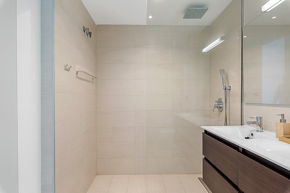 Dette er en leilighet som skiller seg betraktelig ut da det er to leiligheter som er slått sammen til èn. Dette merkes umiddelbart når man kommer inn i leiligheten og ser den romslige stuen og de store skyvedørene som fører ut til den store terrassen.Leilighet har 4 soverom med garderober, 3 delikate bad med gulvvarme, flott kjøkken med kjøkkenøy og en helt fantastisk takterrasse.