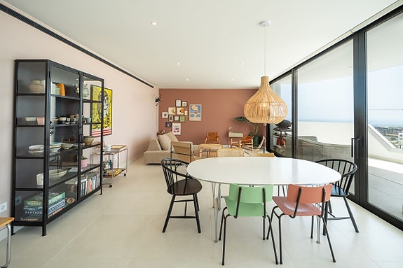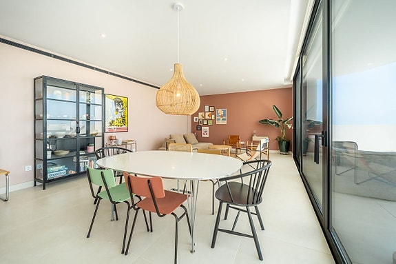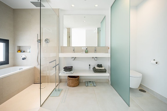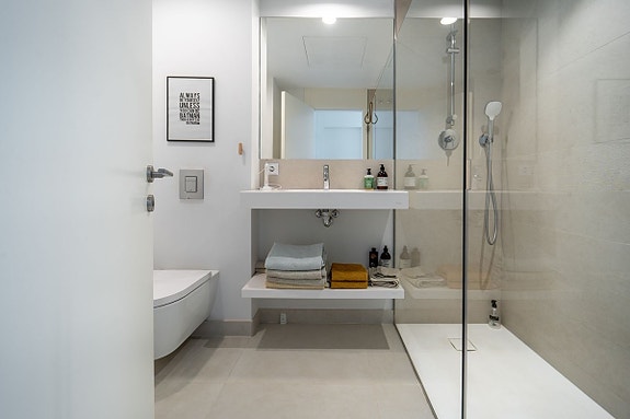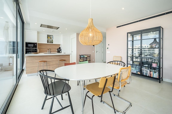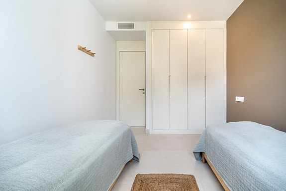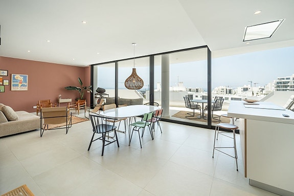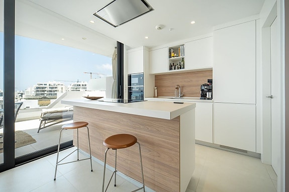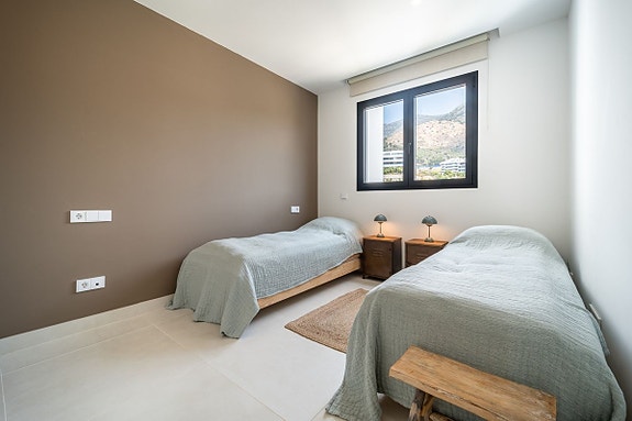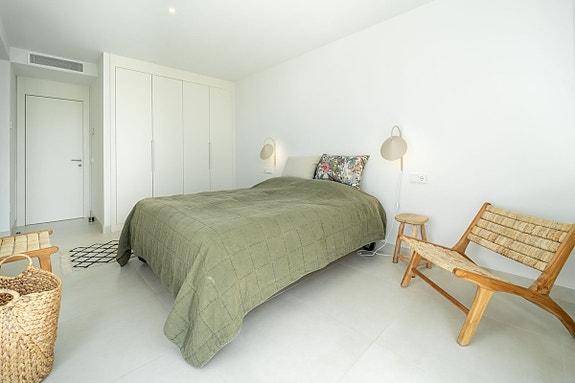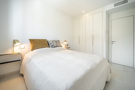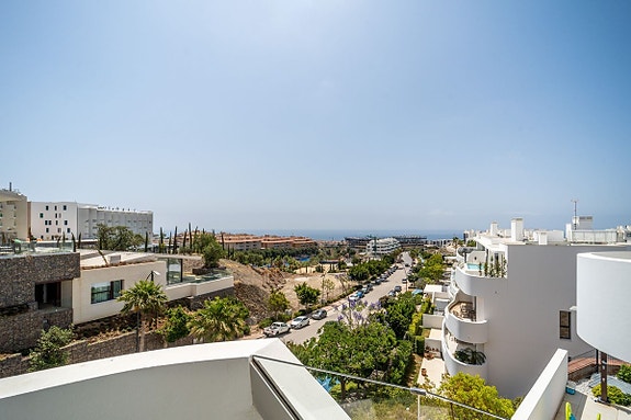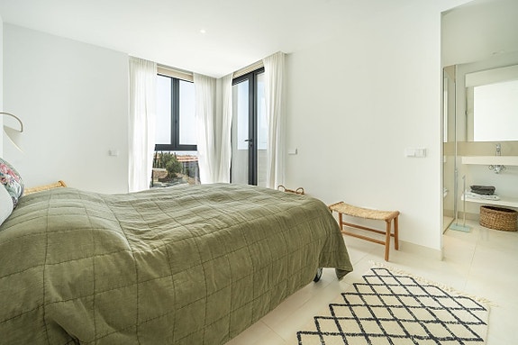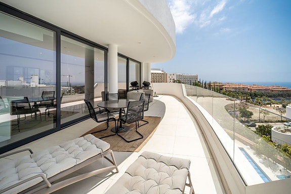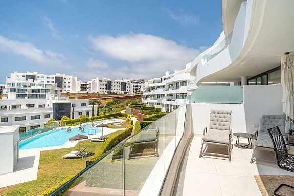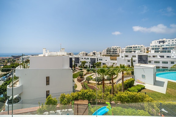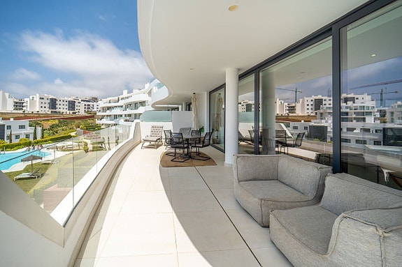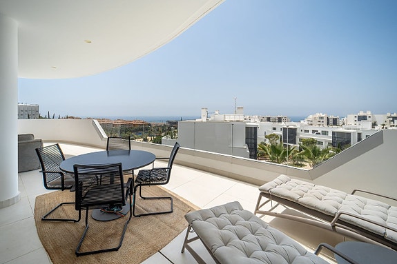 Eksklusiv hjørneleilighet med sørvendt beliggenhet i en prestisjefylt urbanisasjon. Leiligheten har 3 soverom, 2 bad, romslig stue og spisestue med åpen kjøkkenløsning, fullt møblert og utstyrt med moderne hvitevarer. Det finnes også et vaskerom med vaskemaskin og tørketrommel. En stor terrasse på 43 m² gir utsikt over basseng, hage og hav, og hovedsoverommet har åpent bad og tilgang til en mindre terrasse på 3 m².