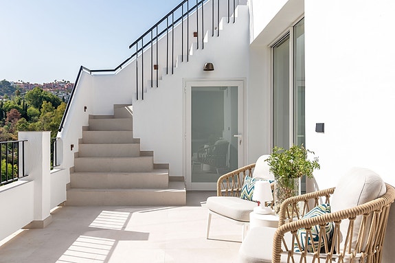 Det åpne kjøkkenet og stueområdet er utstyrt med skreddersydde treinnredninger inspirert av skandinavisk stil, Siemens-apparater og designerbelysning. De tre soverommene har førsteklasses funksjoner som dimbare spotlights, LED-stemningsbelysning og egne bad med Porcelanosa-armaturer og gulvvarme. Utendørsområdene inkluderer en nedre terrasse og en stor øvre terrasse, utstyrt for avslapning og underholdning. Med sine luksuriøse fasiliteter og gjennomtenkte design tilbyr denne duplex-penthousen en raffinert livsstil.Spania1 har gleden av å presentere denne imponerende duplex-penthousen i hjertet av La Quinta, Marbella. Denne luksuriøse leiligheten kombinerer sofistikert design med praktiske fasiliteter og en førsteklasses beliggenhet, med utsikt over golfbanen og delvis havutsikt.