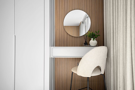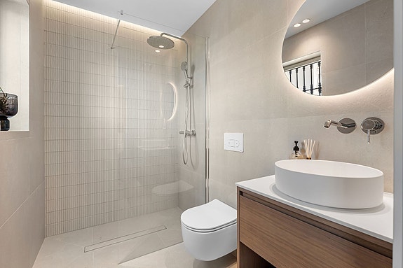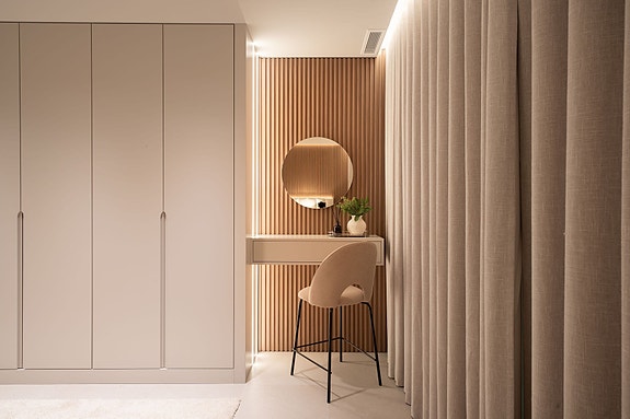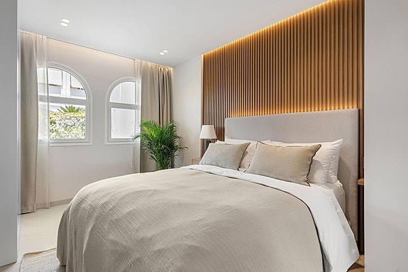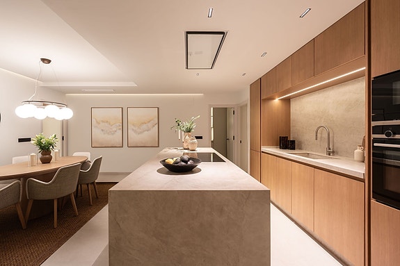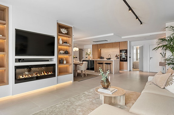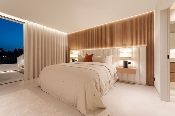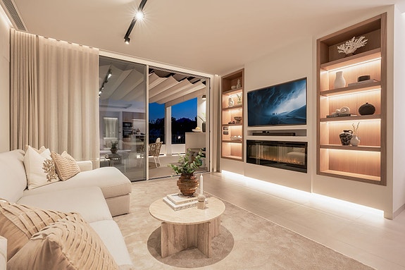Stuen, utstyrt for både avslapning og underholdning, har gulv-til-tak-vinduer, en chaise longue-sofa, og skreddersydde bokhyller med LED-lys.Boligens tre soverom er luksuriøst innredet med dimbare spotlights, LED-stemningsbelysning, blendingsgardiner og skreddersydde møbler. Badene har Porcelanosa-armaturer, gulvvarme og skreddersydde møbler.