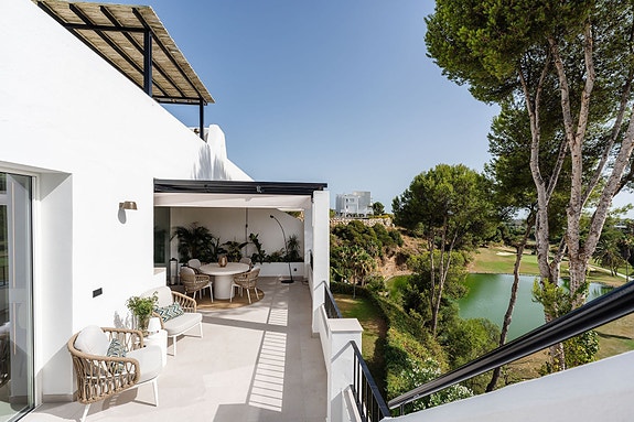 Spania1 har gleden av å presentere denne imponerende duplex-penthousen med et sofistikert design og praktiske fasiliteter, og en fantastisk utsikt over golfbanen og delvis havutsikt.