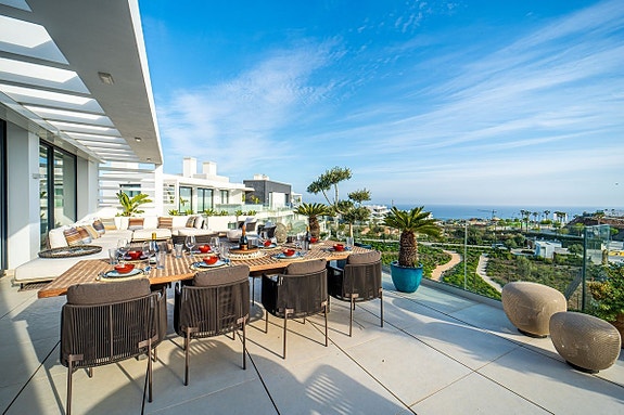 Denne fantastiske skyvillaen ligger i Higuerón West og har imponerende sjøutsikt mot Fuengirola og Afrika. Den inneholder tre soverom, 2,5 bad og en romslig stue på 153 m² med åpen kjøkkenløsning. Boligen er utstyrt med toppmoderne italienske møbler, aircondition, vannbåren gulvvarme og elektriske markiser. Terrassen er utstyrt med grill/utekjøkken og et spiseområde som er perfekt for utendørs underholdning. Villaen tilbyr også to parkeringsplasser og en stor lagringsplass. Urbanisasjonen tilbyr førsteklasses fasiliteter, inkludert svømmebasseng, grønne områder, sikkerhet, og ligger bare 15 minutter fra Malaga flyplass.