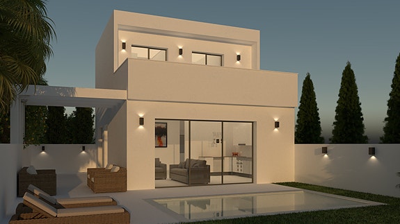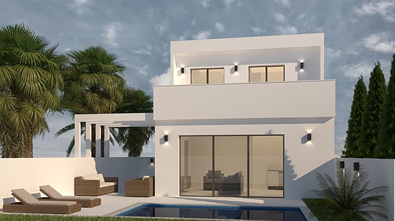 Spania1 har gleden av å presentere 8 flotte villaer med attraktiv beliggenhet kun noen få minutters gange fra butikker og fasiliteter. I første etasje er det en stor stue og kjøkkenløsning og et romslig soverom med bad. I andre etasje er det to soverom og 1 bad med terrasse og trapper som fører til en stor takterrasse.