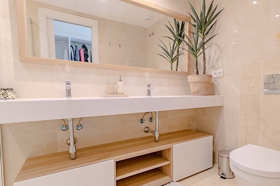 Denne luksuriøse leiligheten i Nueva Andalucía har 4 soverom og 4 bad, i tillegg til et gjestetoalett. Leiligheten har en sørvestlig orientering som gir maksimal naturlig belysning og en romslig, åpen løsning med kjøkken, spisestue og stue. Store glassdører skaper en sømløs overgang mellom innendørs- og utendørsarealene, med en terrasse som tilbyr vakker utsikt over fjell og hav. Hovedetasjen har også to gjesterom og et hovedsoverom, alle med egne bad. Eiendommen har i tillegg tilgang til en terrasse med basseng og privat hage. Leiligheten ligger nær flere kjente golfbaner og andre nødvendige fasiliteter.