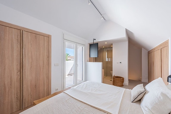 I øverste etasje er det et hovedsoverom med eget bad og en privat terrasse utstyrt med en utendørs dusj.