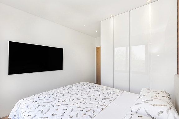Toppleiligheten byr på en romslig stue/spisestue med åpen kjøkkenløsning, fullt utstyrt med hvitevarer. Fra terrassen kan du nyte utsikten over fellesbassenget og frodige grøntområder. Leiligheten har to lyse soverom og et privat solarium med utekjøkken. Parkeringsplass og en privat bod i kjelleren er inkludert.