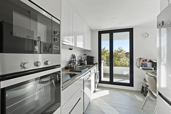 Den har fullt utstyrt og møblert kjøkken.Leiligheten har en solrik 143 m2 takterrasse med jacuzzi og med panorama havutsikt.