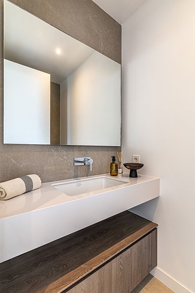 Denne moderne villaen i østlige Marbella kombinerer luksus og praktisk beliggenhet nær sjøen, fjellene og shoppingområder. Villaen har seks soverom, fem bad og en gjestetoalett, med nesten alle soverommene utstyrt med egne bad for optimal komfort og privatliv. Villaens åpne planløsning og moderne kjøkken skaper en lys og romslig atmosfære, med store skyvedører som sømløst knytter inne- og uteområdene sammen. Ute finner du et privat basseng og frodige omgivelser. Kjelleren tilbyr to soverom, mulighet for et treningsrom, et barområde og en vinkjeller. Øverste etasje har tre soverom med balkong og fantastisk utsikt over havet og fjellene.
