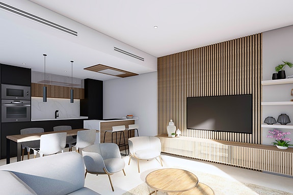 Kjøkken leveres fullt møblert og utstyrt og inkluderer integrert kjøleskap, mikrobølgeovn, stekeovn, vaskemaskin, oppvaskmaskin, avtrekksvifte og kokeplate.