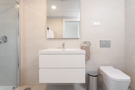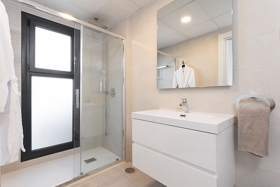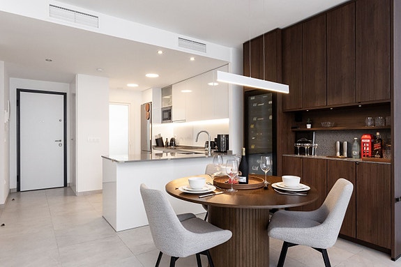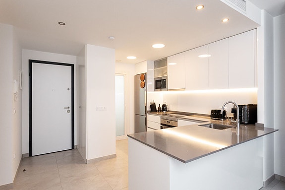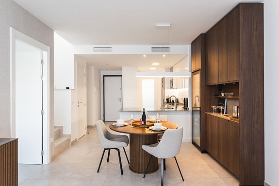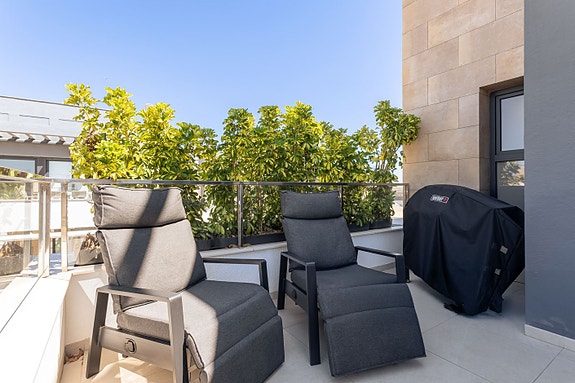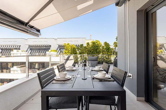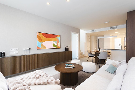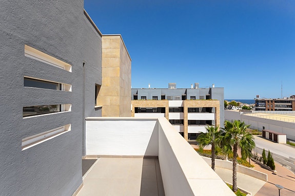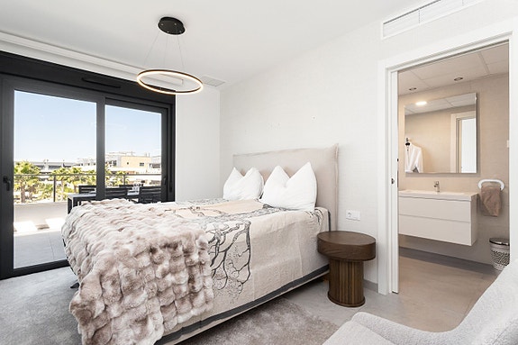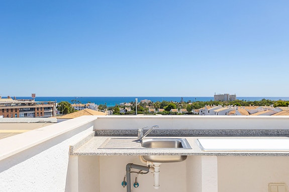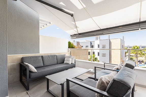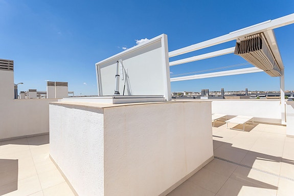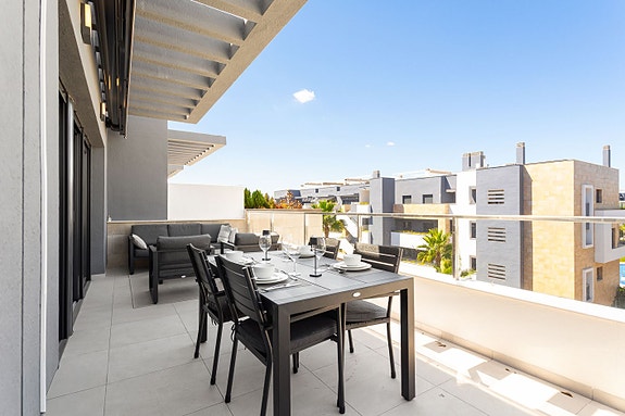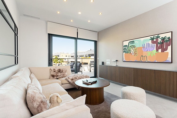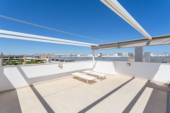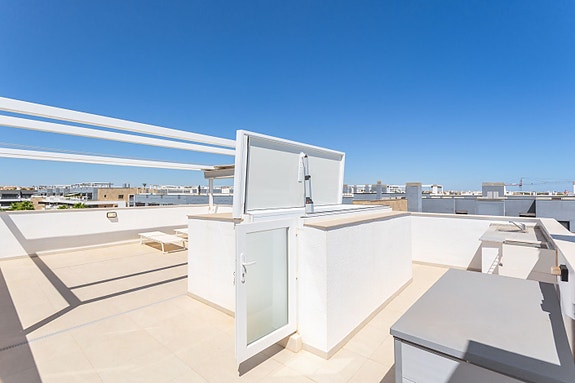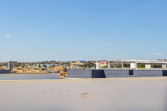 Moderne penthouse fra 2022 med 3 soverom, 2 bad og to terrasser, inkludert en privat takterrasse på 72 m² med panoramautsikt over Middelhavet. Leiligheten ligger i eksklusive Flamenca Village med flere bassengområder, spa, treningsrom, bar og frodige hager – alt innenfor et trygt og attraktivt bomiljø, kun en kort spasertur fra stranden, La Zenia Boulevard og servicetilbud.