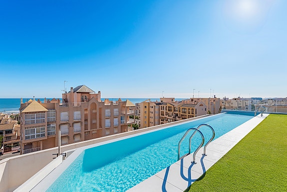 Spania1 har gleden av å presentere denne fantastiske leiligheten som ligger i sentrum av Guardamar. Leiligheten inneholder 2 soverom med innebygde garderober, 2 delikate bad, romslig stue med store vindusflater og flott kjøkken. Leiligheten har også terrasse utenfor stuen i tillegg til at det er stor felles takterrasse med svømmebasseng, treningsrom og toalett. Her kan du nyte solen hele dagen og en fantastisk utsikt over Middelhavet.