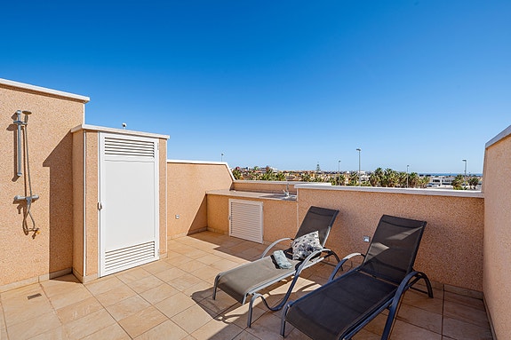 Komplekset tilbyr et felles svømmebasseng med jacuzzi! Alt innenfor et sikkert gated community.Eiendommen er i utmerket stand og inneholder 3 soverom, 2 bad med gulvvarme, romslig stue og spisestue samt åpent kjøkken. Du får tilgang til eiendommen gjennom terrasseområdet i første etasje, og i tillegg har du en stor takterrasse hvor du kan nyte den spanske solen hele året.