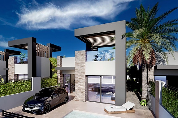Spania1 presenterer et flott prosjekt med moderne frittstående villa med 3 soverom, 2 bad, en åpen stue og kjøkkenløsning – alt på ett plan